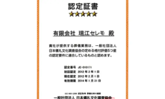 一之江セレモニーホールでは、一般財団法人 日本儀礼文化調査協会(JECIA)から『消費者が安心してご相談できる葬儀社』の証となる『5つ星認定』を2012年2月1日に取得致しました。 (認定番号 JE-010171)日本儀礼文化調査協会(JECIA)は、消費者にかわって葬儀会社を評価・格付けを行う第三者格付機関で、最高ランクである『5つ星認定』が与えられるのは、総合評価得点80%以上の評価を得た葬儀会社のみです。